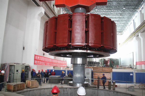 定子機(jī)座分2瓣,在工地安裝現(xiàn)場(chǎng)組圓、疊片及下線;定子整體通過上機(jī)架起吊。下圖為定子整體起吊,準(zhǔn)備吊入機(jī)坑。