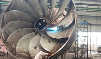 Vietas轉(zhuǎn)輪,葉片單片凈重量3169Kg,轉(zhuǎn)輪總重量81261Kg,直徑最大Φ5584mm,高度2925mm,由1個上冠、1個下環(huán)和13片葉片組裝焊接而成,
